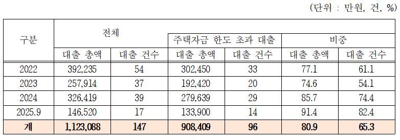 지난 2022년부터 2025년 9월까지 임직원에게 지급한 주택자금대출 총액은 112억 3,000만원에 달한다. 이 중 90억 8,000만원(80.9%)이 정부 지침상 한도인 1인당 7천만 원을 초과한 대출이었다. 대출 건수 기준으로도 147건 중 96건(65.3%)이 한도 초과로 집계됐다.