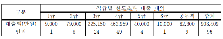직급별로는 3급~4급 등 고위직 간부층을 중심으로 한도 초과 대출이 다수 확인되어 기관 내부의 도덕적 해이와 통제 부재가 우려되는 상황이다.