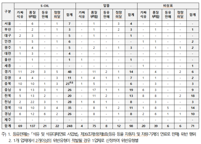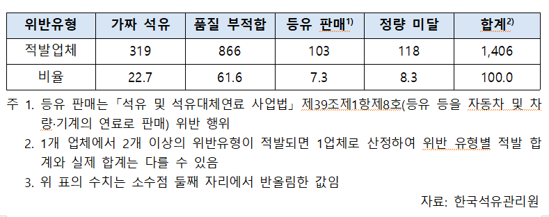 위반유형별로는 ‘품질 부적합’이 866건(61.6%)으로 가장 많았고, ‘가짜 석유’ 319건(22.7%), ‘정량 미달’ 118건(8.4%), ‘등유 판매’ 103건(7.3%) 순이었다. 특히, 가짜 석유는 등유 등을 혼합해 판매하는 행위로 소비자 피해, 차량 손상, 환경오염 유발 우려가 매우 크다.
