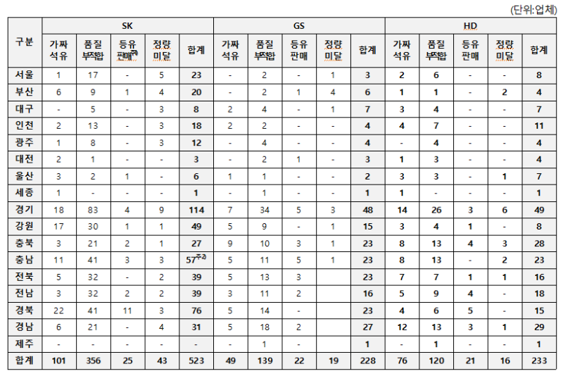 정유사별 적발 건수는 SK에너지 523건으로 가장 많았으며, S-OIL 248건, HD현대오일뱅크 233건, GS칼텍스 228건, 알뜰주유소 98건 순으로 나타났다. SK에너지, S-OIL, HD현대오일뱅크 3사 합산 적발 건수가 전체의 71.4%를 차지했다.