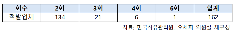 더욱 심각한 것은 반복 위반 사례가 162곳에 달한다는 점이다. 2회 적발 134곳, 3회 이상 적발이 28곳이었다. 특히, 경남 창원시의 한 현대오일뱅크 주유소는 4개월간 6회나 적발된 것으로 확인됐다.