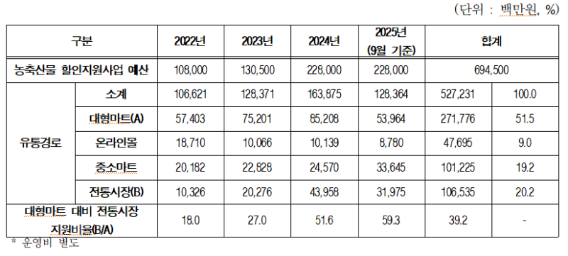 더욱이 지난 9월 감사원의 농림축산식품부 정기감사 결과, 농축산물 할인지원사업이 대형유통업체의 이익 중심으로 운영되어왔음이 드러나 더 큰 충격을 주고 있다.