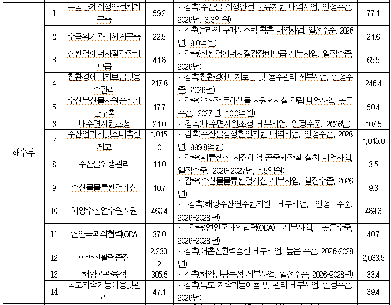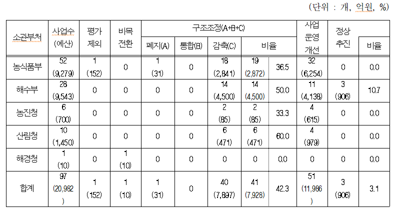 농림축산식품부 52개 사업, 해양수산부 28개 사업, 농촌진흥청 6개 사업, 산림청 10개 사업, 해양경찰청 1개 사업 등 총 97개 국고보조사업 중 ‘정상추진’ 평가를 받은 사업은 유일하게 해양수산부 소관 3개 사업으로, 이는 전체 사업의 3.1%에 불과했다.