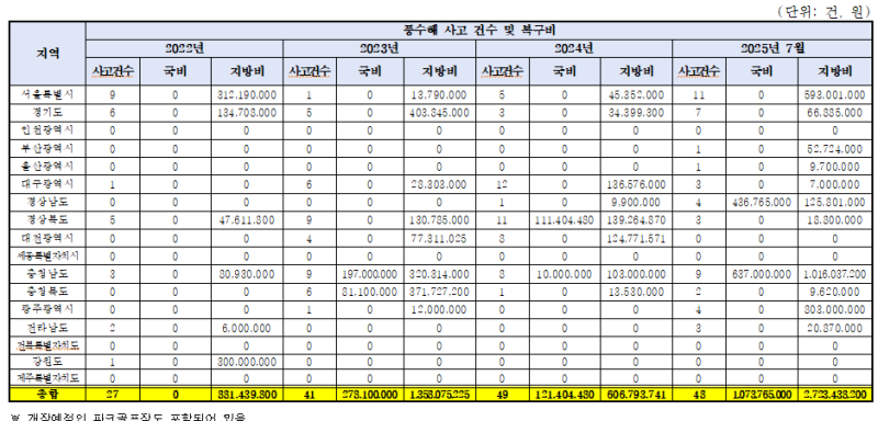 같은 기간 발생한 풍수해 사고 건수는 충남 29건, 경북 28건, 서울 26건 순으로 많으며, 충남은 복구비용과 사고 건수 모두 전국 지자체 중 가장 높은 수준을 보였다.