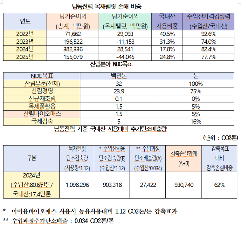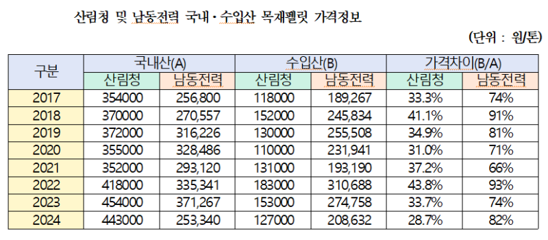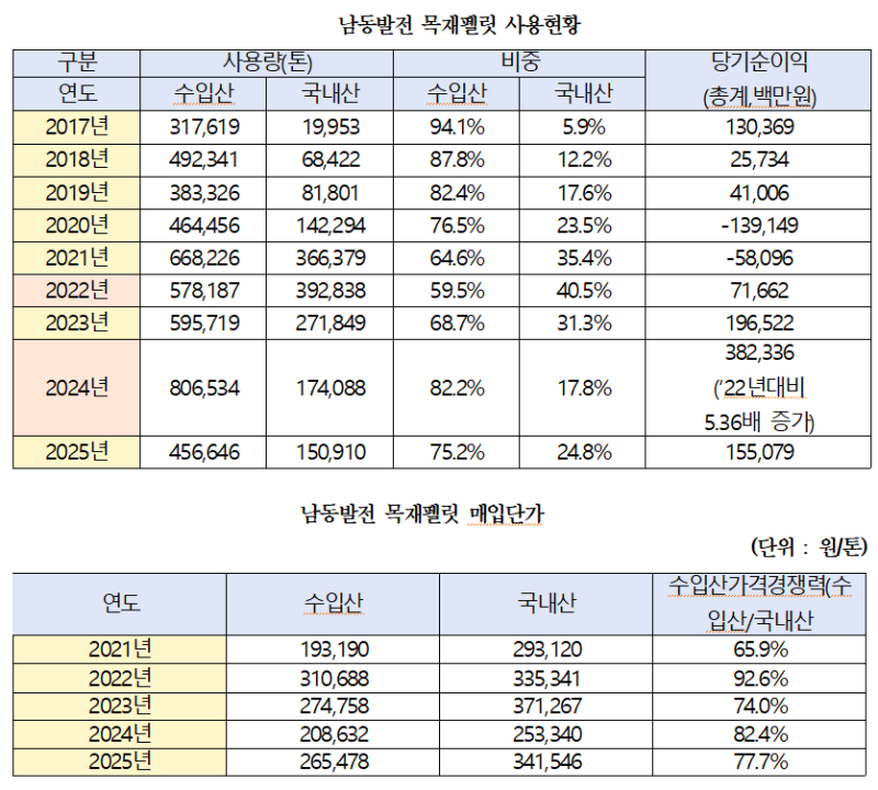 자료에 따르면, 2022년 당시 수입산 목재펠릿 가격이 국내산 대비 92.6% 수준이였을 때 남동발전의 국내산 사용비중은 40.5%였으며, 그해 목재펠릿 발전으로 291억 원의 순이익을 올렸다. 그러나 2023년 이후 수입산 단가가 더 낮아지자, 남동발전은 국내산 사용을 급격히 줄이고 수입산 중심으로 발전을 전환한 것으로 확인됐다.