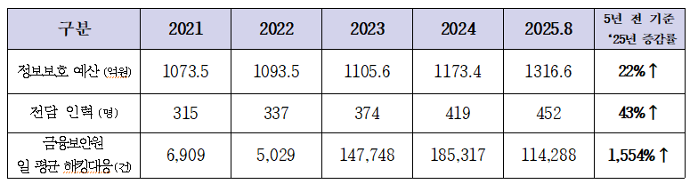해킹 시도가 급증하는 상황에서 업계 전체 예산 확대가 미흡하고 회사별 대응도 제각각이라는 점이 확인된다. 금융보안원이 국회에 제출한 자료에 따르면 최근 5년간 해킹 시도에 대한 일평균 대응 건수는 2021년 6,909건에서 2025년 8월 말 114,288건으로 1,554% 증가했다.
