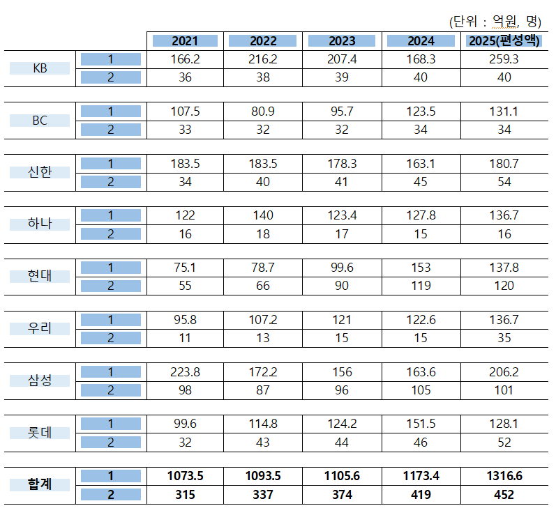 박찬대 의원실이 카드사별로 제출받은 전수조사 결과에 따르면, 2021년~2025년 사이 정보보호·개인정보보호·FDS·모의해킹·보안관제 예산은 2021년 1,073억원에서 2025년 1,316억원으로 22.6% 증가했고, 정보보호 전담 인력은 2021년 315명에서 2025년 452명으로 43.5% 소폭 증가한 것으로 나타났다.