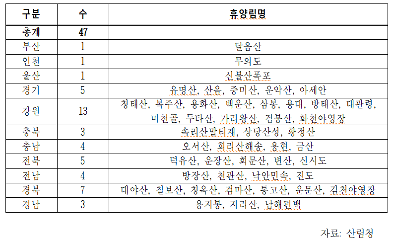 한편, 2025년 8월말 기준, 국립자연휴양림은 부산시 1개, 인천시 1개, 울산시 1개, 경기도 5개, 강원도 13개, 충청북도 3개, 충청남도 4개, 전라북도 5개, 전라남도 4개, 경상북도 7개, 경상남도 3개 등 총 47개로 조사됐다.