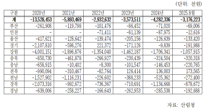 특히, 강원도, 경상북도, 전라남도, 충청북도, 경상남도, 울산시, 충청남도, 부산시, 인천시 등에 위치한 국립자연휴양림은 최근 5년여간 단 한 차례도 영업이익이 발생하지 않은 것으로 나타났다.
