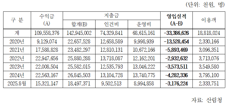 이어 수입액은 총 1,095억 5,837만 원인 반면, 인건비와 운영비 등 지출액은 총 1,429억 4,500만 원으로, 최근 5년여간의 영업적자가 333억 8,662만 원에 달하는 것으로 나타났다.