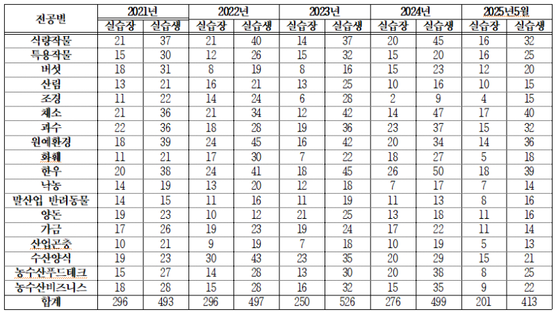 한편, 학생들의 안전을 담보해야 할 농수산대학교의 실습장 관리·감독도 부실한 것으로 확인됐다. 최근 5년간 안전 규정 위반 등으로 실습기관 지정이 취소된 사례는 단 13건에 불과했다. 이는 전체 실습장의 1%에 불과한 수치다.