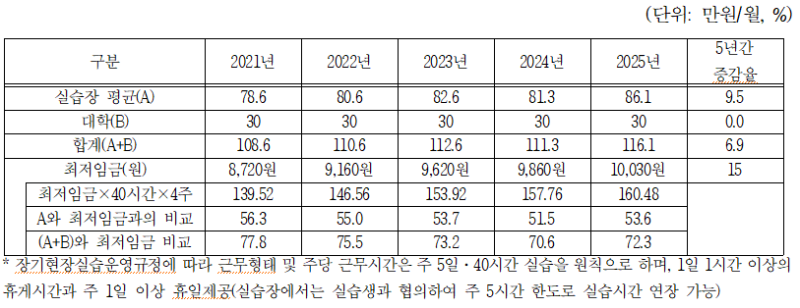 실제 실습생들은 실습장에서 대부분 주 5일·40시간 이상의 숙박형으로 현장에 상주하며 실제 노동을 하고 있지만, 실습장에서의 평균 지원금(급여)는 2022년 80만 6천원, 2023년 82만 6천원, 2024년 81만 3천원, 2025년 86만 1천원으로 80만원대에 그쳐 최저임금의 50% 수준에 불과하다