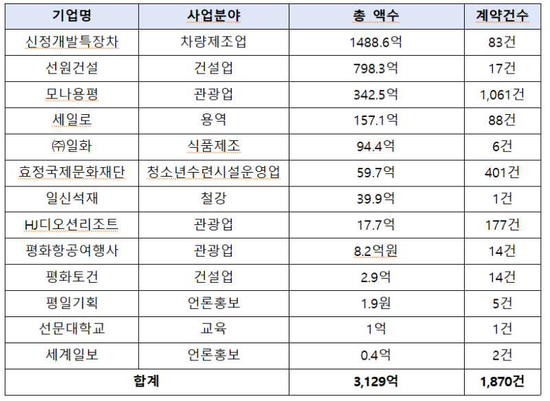 통일교 재단 기업 가운데 신정개발특장차가 가장 많은 계약을 수주해, 10년간 83건·1,489억 원 규모의 계약을 체결했다. 그 뒤로 선원건설(17건·798억 원), 모나용평(1,061건·343억 원) 등이 뒤를 이었다.