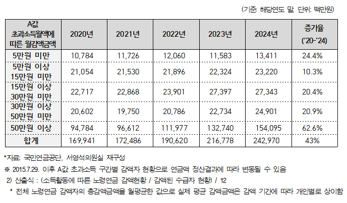 2024년 한 해 동안 감액된 연금액은 총 2,429억 7천만 원으로 집계됐다. 이는 2020년 1,699억 원에서 43% 증가한 수치다.