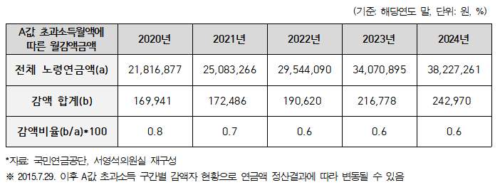 전체 노령연금액 대비 감액액 비율은 0.6% 수준으로, 2020년(0.8%)에 비해 다소 낮아졌지만, 초고령사회 진입과 노인고용률 증가의 영향으로 감액자 수는 매년 증가했다.