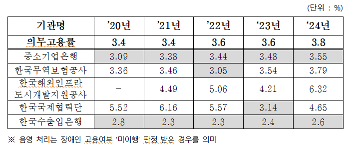 중소기업은행·한국무역보험공사·한국해외인프라도시개발지원공사·한국국제협력단 등 유사업무 기관과 비교하더라도, 수출입은행의 장애인 고용률은 현저히 낮은 수준이다.