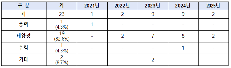 에너지원별로 보면 사망사고 23건 중 태양광이 19건(82.6%)으로 가장 많았고, △풍력 1건(4.3%) △수력 1건(4.3%)이 뒤를 이었다. 특히 태양광의 경우, 지붕 위 태양광 설치 중 발생한 사고가 19건 중 17건(89.4%)으로 가장 많은 것으로 나타났다.