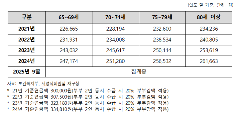 국민연금공단 자료에 따르면, 기초연금을 함께 받는 노인 부부는 2024년 기준 297만 명으로 2021년(256만 명) 대비 16% 증가했다. 부부 동시 수급자의 월평균 연금액은 2024년 24만 7천 원으로 기초연금 산정의 기준이 되는 기준연금액(33만 4천 원)에 한참 못 미치는 수준이다.