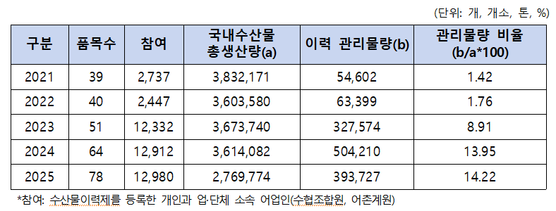 2025년에도 총 생산량 276만 9,774톤 중 이력관리 물량은 39만 3,727톤(14%)에 그쳤다.