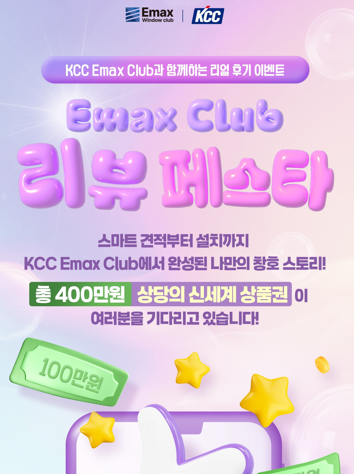 KCC는 올해 12월 31일까지 이맥스 클럽 홈페이지에 회원가입 후 스마트견적을 통해 시공까지 완료하고 후기를 작성한 고객을 대상으로 총 400만원 상당의 신세계 상품권을 증정하는 ‘리뷰페스타’ 이벤트를 실시한다.