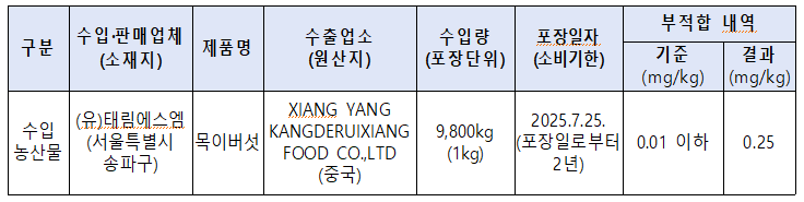 식품의약품안전처(처장 오유경)는 수입식품등 수입판매업체인 ‘(유)태림에스엠(서울특별시 송파구)’이 수입해 판매한 수입산 ‘목이버섯’에서 잔류농약(카벤다짐: 곰팡이로 인한 병해를 예방하기 위해 과일, 채소 등에 사용하는 농약 )이 기준치(0.01mg/kg 이하) 보다 초과 검출되어 해당 제품을 판매 중단하고 회수 조치한다고 밝혔다.