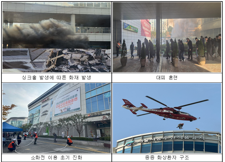 이번 훈련은 행정안전부 주관으로 전국적으로 실시되는 ‘안전한국훈련의’ 일환으로 진행되었으며, 도심지 싱크홀 발생 및 다중밀집시설 대형 화재 사고와 같은 대규모 복합재난 상황을 가정하여 가락시장(가락몰 일원)에서 민관 합동으로 500여명이 훈련에 참여했다.