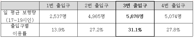 특히 3번 출입구의 퇴근시성수역 출입구별 이용률 현황간대 이용률은 31.1%로 성수역에 위치한 4개 출입구 중 가장 이용률이 높다.