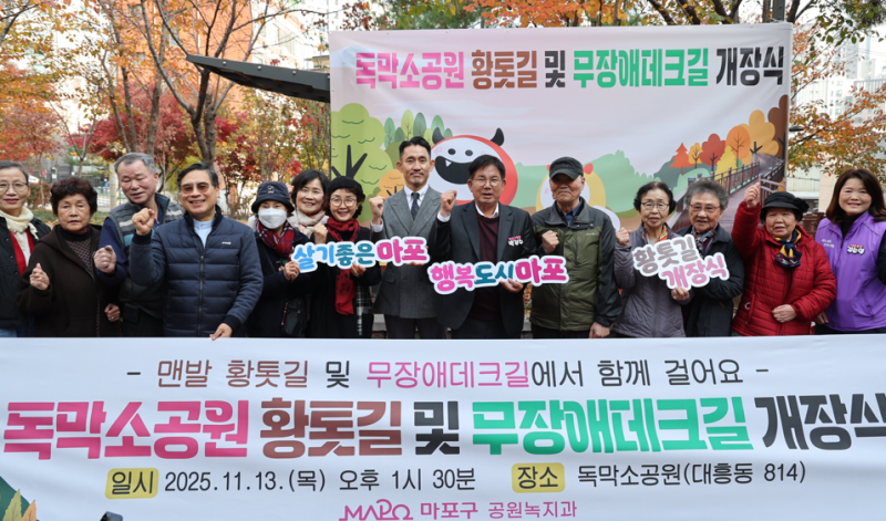 마포구(구청장 박강수)는 이대역 인근 독막소공원(대흥동 814)에 황톳길과 무장애데크길을 조성하고 11월 13일 오후 1시 30분 개장식을 개최했다.