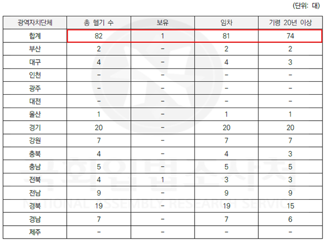자체 임차 헬기 기령을 구간별로 살펴보니 ▲1~10년 2대 ▲11~20년 9대 ▲21~30년 25대 ▲31~40년 25대 ▲41~50년 20대 ▲50년 이상 6대로 기령이 21년에서 40년 사이인 기체가 가장 많았으며, 최고 기령의 헬기는 충청남도 본청의 S-61N 헬기와 영주시 S-58T 헬기로 63년인 것으로 파악됐다. #붙임1