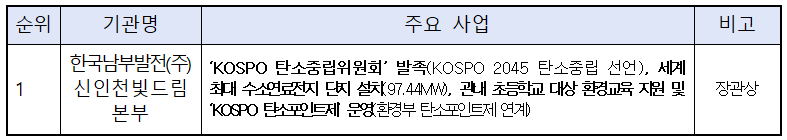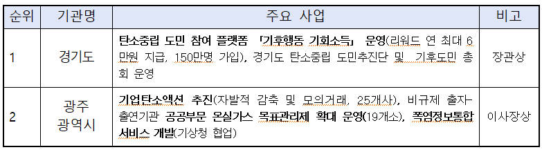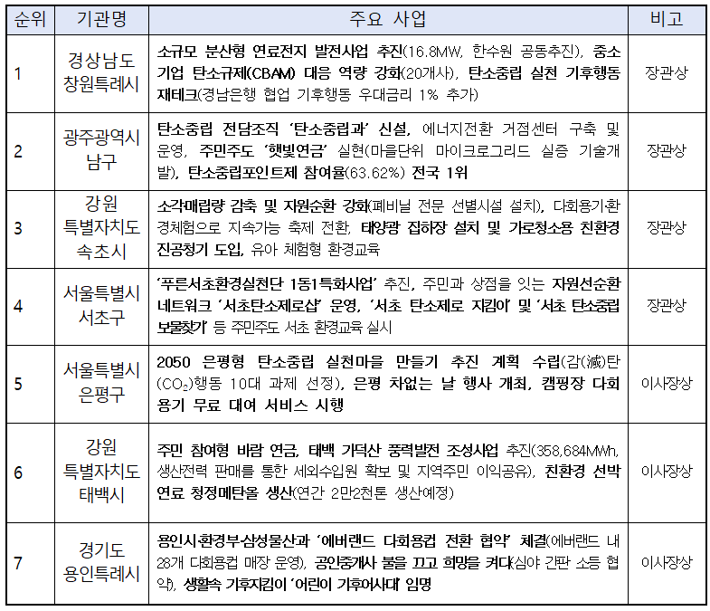 이행성과 부문 우수사례로는 △경기도, △경상남도 창원특례시, △광주광역시 남구, △강원특별자치도 속초시, △서울특별시 서초구 총 5개 지자체가 기후에너지환경부 장관상을 수상하며 △광주광역시, △서울특별시 은평구, △강원특별자치도 태백시, △경기도 용인특례시는 한국환경공단 이사장상을 수상한다.
