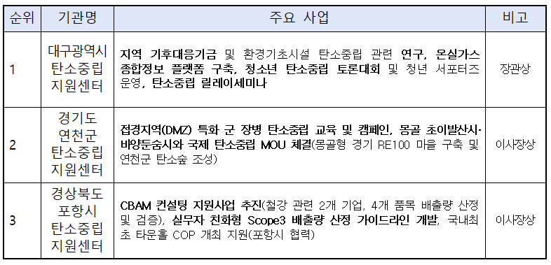 이행협력 부문에서는 기후에너지환경부 장관상에 △대구광역시 탄소중립지원센터, △한국남부발전(주) 신인천빛드림본부가 우수사례로 선정되었다. 한국환경공단 이사장상은 △경기도 연천군 탄소중립지원센터, △경상북도 포항시 탄소중립지원센터가 선정되었다.