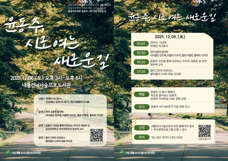 내를 건너서 숲으로 도서관 관계자는 “이번 행사를 통해 윤동주 시인의 작품을 보며 시대를 초월한 문학적 정신을 재조명하고, 시가 지닌 순수함과 성찰의 언어를 통해 시민들이 자신의 삶과 사회를 돌아보는 시간이 되기를 바란다”라고 말했다.