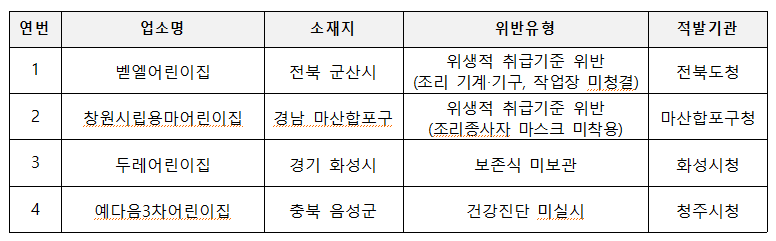 점검 결과 주요 위반 내용은 ▲조리용 기계‧기구 및 작업장 청결 관리 미흡, 조리종사자 마스크 미착용 등 위생적 취급 기준 위반(2건) ▲보존식 미보관(1건) ▲건강진단 미실시(1건)이며, 적발된 업소는 관할 관청에서 과태료 부과 등 행정처분 조치하고 6개월 이내에 다시 점검할 계획이다.
