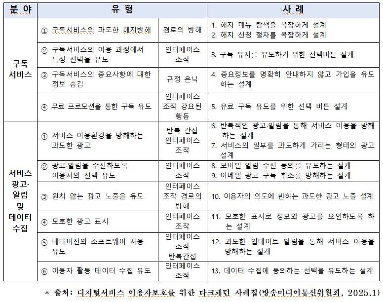 방미통위가 제출한 계획안에 따르면 점검 대상은 여행·쇼핑·OTT·AI·웹툰·금융·배달 등 8개 분야에서 이용자 수 상위 5개 앱을 포함한 총 40개 앱을 대상으로 하며, 점검항목은 방미통위가 지난 1월에 발간한 ‘디지털서비스 이용자보호를 위한 다크패턴 사례집’ 내 주요사례를 기반으로 구독해지 방해, 정보 은닉, 이용자 데이터 과다수집 등 13개 유형의 다크패턴 사례를 집중 점검할 예정이다.