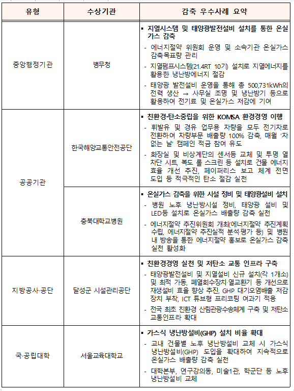 2024년도 온실가스 감축성과 우수 기관으로는 △중앙행정기관 중에서는 병무청, △공공기관 중에서는 한국해양교통안전공단, 충북대학교병원, △지방공사‧공단 중에서는 달성군 시설관리공단, △국‧공립대학 중에서는 서울교육대학교가 선정되었다.