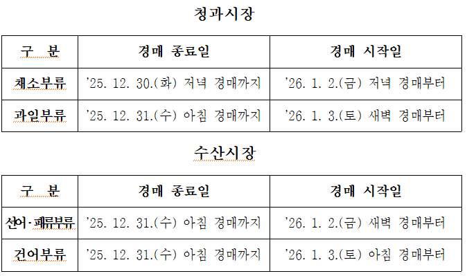 가락시장 수산부류 중 선어‧패류부류는 ’25. 12. 31.(수) 아침 경매를 끝으로 휴장했다가 ’26. 1. 2.(금) 새벽 경매부터 다시 시작될 예정이며, 건어부류는 ’25. 12. 31.(수) 아침까지 경매가 열리고 ’26. 1. 3.(토) 아침 경매부터 재개된다.