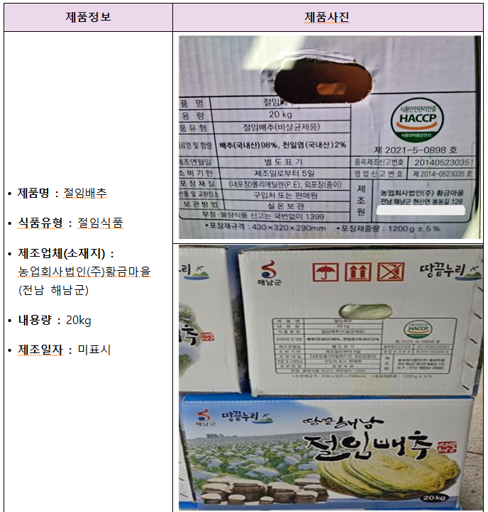 식품의약품안전처(처장 오유경)는 식품제조·가공업체인 ‘농업회사법인(주)황금마을(전남 해남군 소재)’이 제조·판매한 ‘절임배추(식품유형: 절임식품)’에 제조일자를 표시하지 않은 사실이 확인되어 해당 제품을 판매 중단하고 회수 조치한다고 밝혔다.