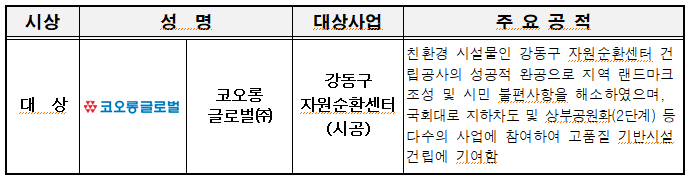 코오롱글로벌㈜은 강동구 자원순환센터를 2020년부터 착공하여 금년 10월 준공에 이르기까지 기존 자원순환센터에 대한 인식을 전환하고, 시민의 삶의 질 향상과 지역 랜드마크 조성에 기여한 공이 인정돼 종합 대상을 수여했다.