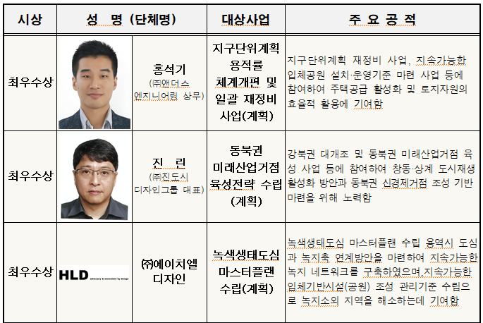 매력서울 분야 최우수상은 서울 동북권 미래산업거점 육성 전략을 수립한 진린 ㈜도시디자인그룹 대표, 지구단위계획 용적률 체계개편 및 일괄 재정비 사업의 홍석기 ㈜앤더스엔지니어링 상무, 지속가능한 입체기반시설(공원) 조성기준을 마련한 ㈜에이치엘디자인이 수상하였다.