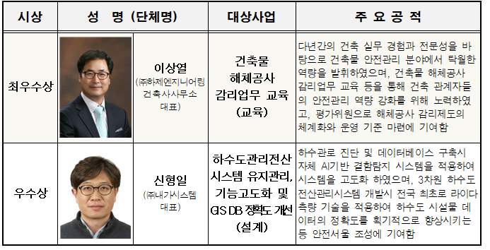 우수상으로는 최영국 ㈜거송 대표(건설기술심의위원 및 서울아리수본부 기술자문위원), 정동철 ㈜극동전기기술단 사장(건설기술심의위원 전기전력설비 분야) 등 2인이 최종 선정되었다.