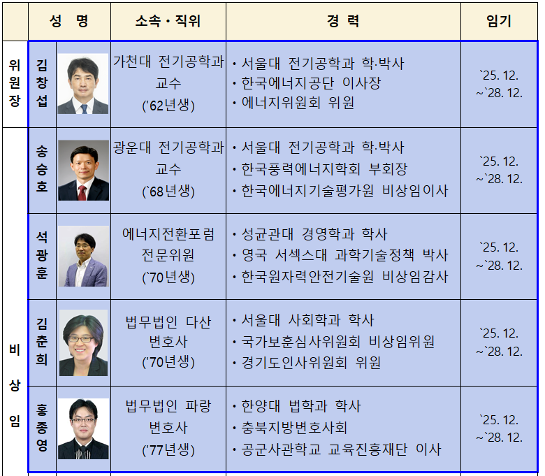 이번에 위촉된 위원은 김창섭 가천대 교수를 비롯하여 전기공학 분야에 송승호(宋丞鎬) 광운대 전기공학과 교수, 에너지 분야에 석광훈(石光勳) 에너지전환포럼 전문위원, 법률 분야에 김춘희(金春姬) 법무법인 다산 변호사 및 홍종영(洪堹英) 법무법인 파랑 변호사로 구성되었다.