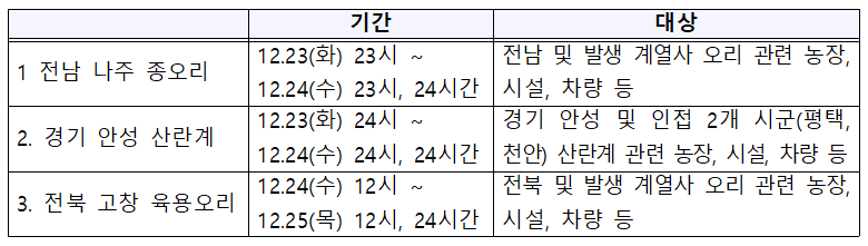 둘째, 최근 산란계 농장에서 고병원성 조류인플루엔자 발생이 확인된 안성, 천안 등 추가 발생 위험이 높은 지역에 12월 24일부터 농식품부 과장급을 파견하여 방역지역 등 현장에서 방역 조치가 차질없이 이행될 수 있도록 지도·관리한다.