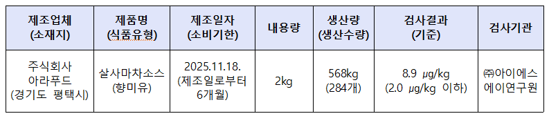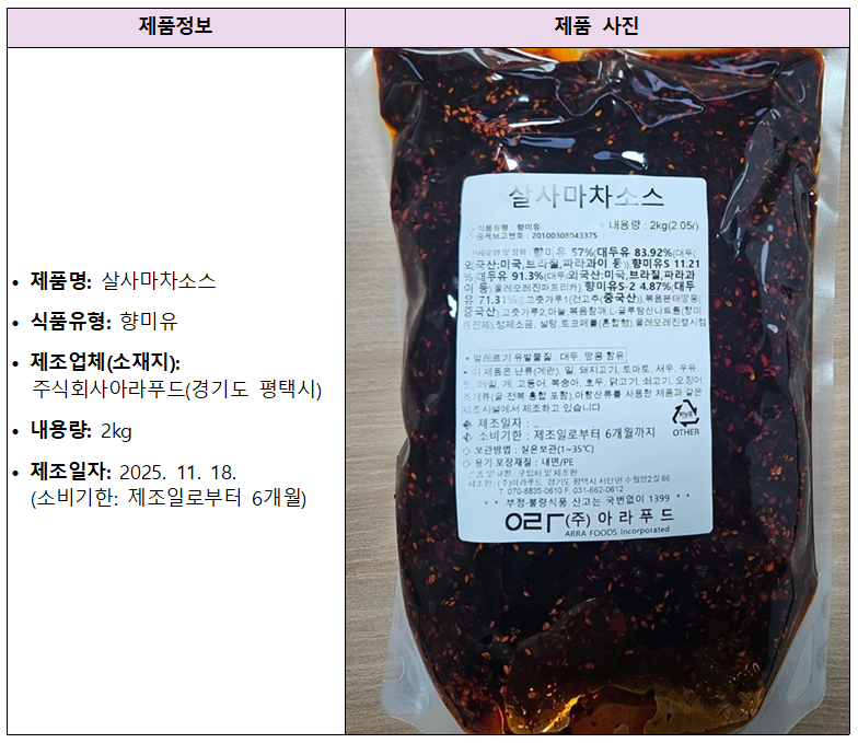 식품의약품안전처(처장 오유경)는 식품제조·가공업체인 ‘주식회사아라푸드(경기도 평택시 소재)’가 제조·판매한 ‘살사마차소스(식품유형 : 향미유)’에서 벤조피렌이 기준치 보다 초과 검출되어 해당 제품을 판매 중단하고 회수 조치한다고 밝혔다.