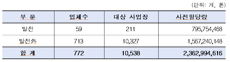 발전 외 부문은 산업·수송·건물 등 발전에 속하지 않는 모든 기업을 대상으로 하며, 713개 기업에게 15억 6,724만톤이 할당됐다.