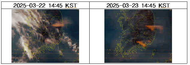 위색조합(FCC) 기법을 적용한 RGB 영상에서도 산불 연기 포착(주황색)