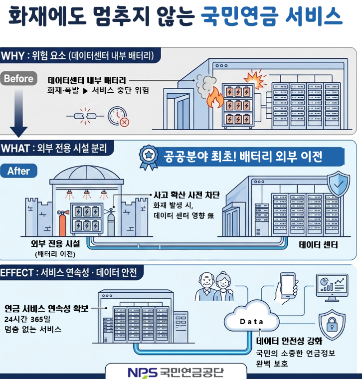 외부 전용 시설은 배터리 특성에 맞춘 감시와 안전 설비를 갖추고 있고, 데이터 처리 시스템과 완전히 분리돼 있다. 따라서 배터리 화재가 발생하더라도 연금 지급, 조회, 민원 처리 등 핵심 서비스에 직접적인 영향을 미치지 않는다.