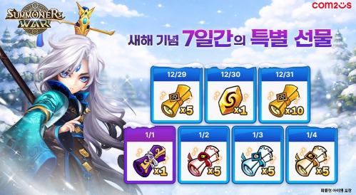 먼저 ‘서머너즈 워: 천공의 아레나’는 오는 1월 4일까지 ‘새해 기념 7일간의 특별 선물’ 이벤트를 진행한다. 이벤트 기간 동안 접속만 해도 전설의 소환서, 신비의 소환서 등을 지급하며, 특히 새해 첫날에는 데빌몬, 크리스탈 등 특별 신년 선물을 보너스로 제공한다.