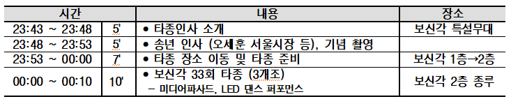 오 시장은 제야의 종 타종 직전, 무대에서 타종행사에 참석한 시민들에게 한 해를 마무리하는 송년 인사와 2026년 새해를 맞이하는 덕담을 함께 전한다. 이어서 12시 정각에 맞춰 타종인사들과 새해를 알리는 보신각 타종을 진행한다.