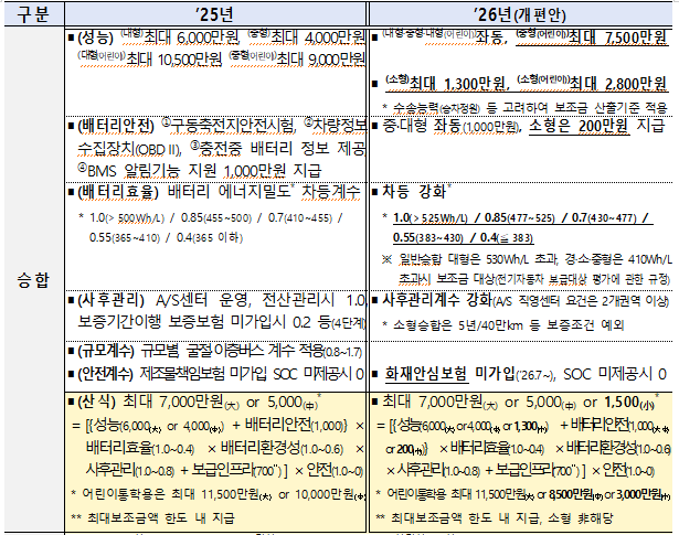 또한, 2026년부터는 그간 국내출시된 전기차 모델이 없었던 소형급 전기승합차(수송능력 고려해 승차정원 11~15인 & 크기 7m 미만 차량 대상으로 보조금 산출 ), 중·대형급 전기화물차 에 대해서도 국내 시장 출시 예정임을 고려하여 보조금 지원을 시작할 예정이다.