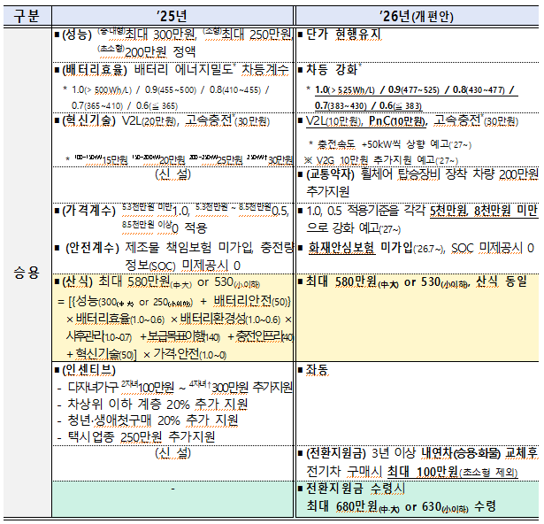 이번 보조금 개편안은 예산 범위( ’26년도 예산(총 1조 5,953.7억원) : 전기승용 7,800억원, 전기승합 2,795억원, 전기화물 3,583.7억원, 전환지원(승용·화물) 1,775억원 )내에서 이러한 보급 확대 추세를 이어갈 수 있도록 효과적인 지원방안을 찾아내고 더욱 경쟁력 있는 신차 출시를 유도하는 한편, 전기차와 관련된 새로운 기술 및 산업의 도입·확산을 촉진하는 방향으로 마련되었다. 개편안의 세부 내용은 다음과 같다.